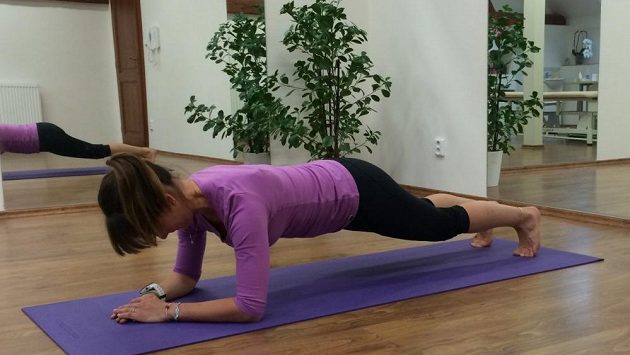 Představte si ho jako sud a snažte se jej nádechem roztáhnout. Ve středu těla jste pevní a nehybní. Ideálně byste měli cítit, že se začne chvět spodní břicho. Respektive, to by mělo přijít zcela automaticky, pokud dobře napřímíte páteř. Nejlepší je cvičit bokem k zrcadlu a kontrolovat, že celá záda až po hlavu jsou opravdu rovná jako prkno. Cílem není délka výdrže, ale dosažení kvalitní pozice.
